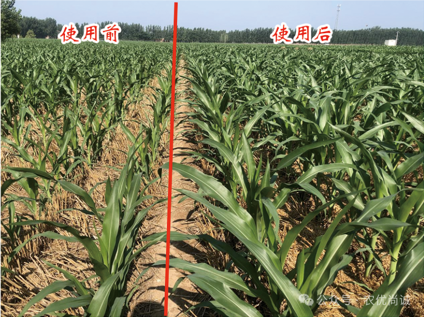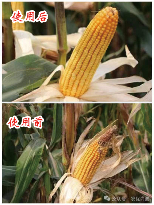 玉米使用该套餐后,营养迅速补充,细胞分裂素立刻反应,玉米植株整体发黑油绿,叶片肥厚,茎秆粗壮,根系发达,玉米棒穗整体拉长,直径增加,玉米籽粒饱满,促进活杆成熟,延长授粉,不秃尖。